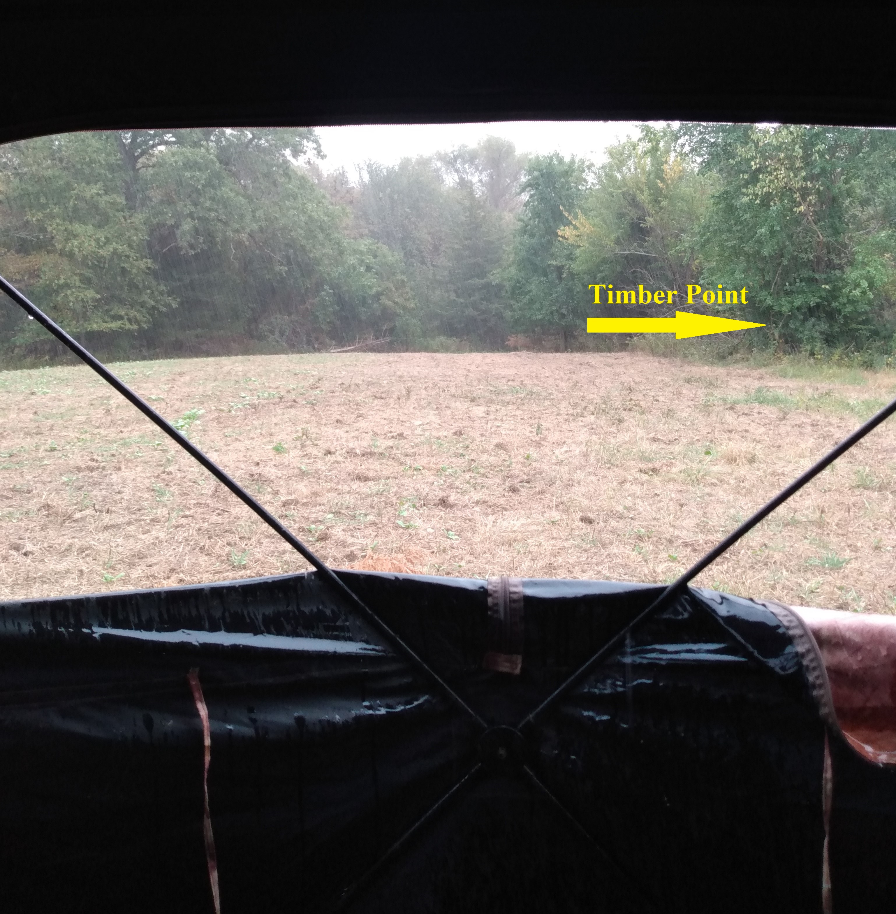 10/6 Sat a ground blind on a neighboring farm, the same farm we sat opening night. We had another almost straight east wind. We set up the chairs in the blind so that we could see a long fence line to our southwest, and then some open tillable to our north. When we got there, we realized the farm renter had knifed in pig shit on all the tillable ground. If you’ve never smelt knifed in pig shit, let me tell you it can be pretty intense. We stuck it out. We did also get some light rain…not enough to do anything but enough to make us glad we were in a blind. This farm has seen only very small amounts of rain since late July. The food plot I planted there late August has seen almost no rain…like only a hundredth here and there. The plot therefore is not doing much because the seeds just will not germinate with no moisture. However, the plot/blind is setup to take advantage of a water hole to the west, and a timbered point forcing deer outward from the edge of the timber as they walk from south to north. The plan is when they walk the edge they are forced out toward the blind making them in range…and the one doe we saw tonight did just that. She came out to our south, worked her way north toward our plot…then came out to make it past that point. Perfect kill scenario. So, the set works as planned.