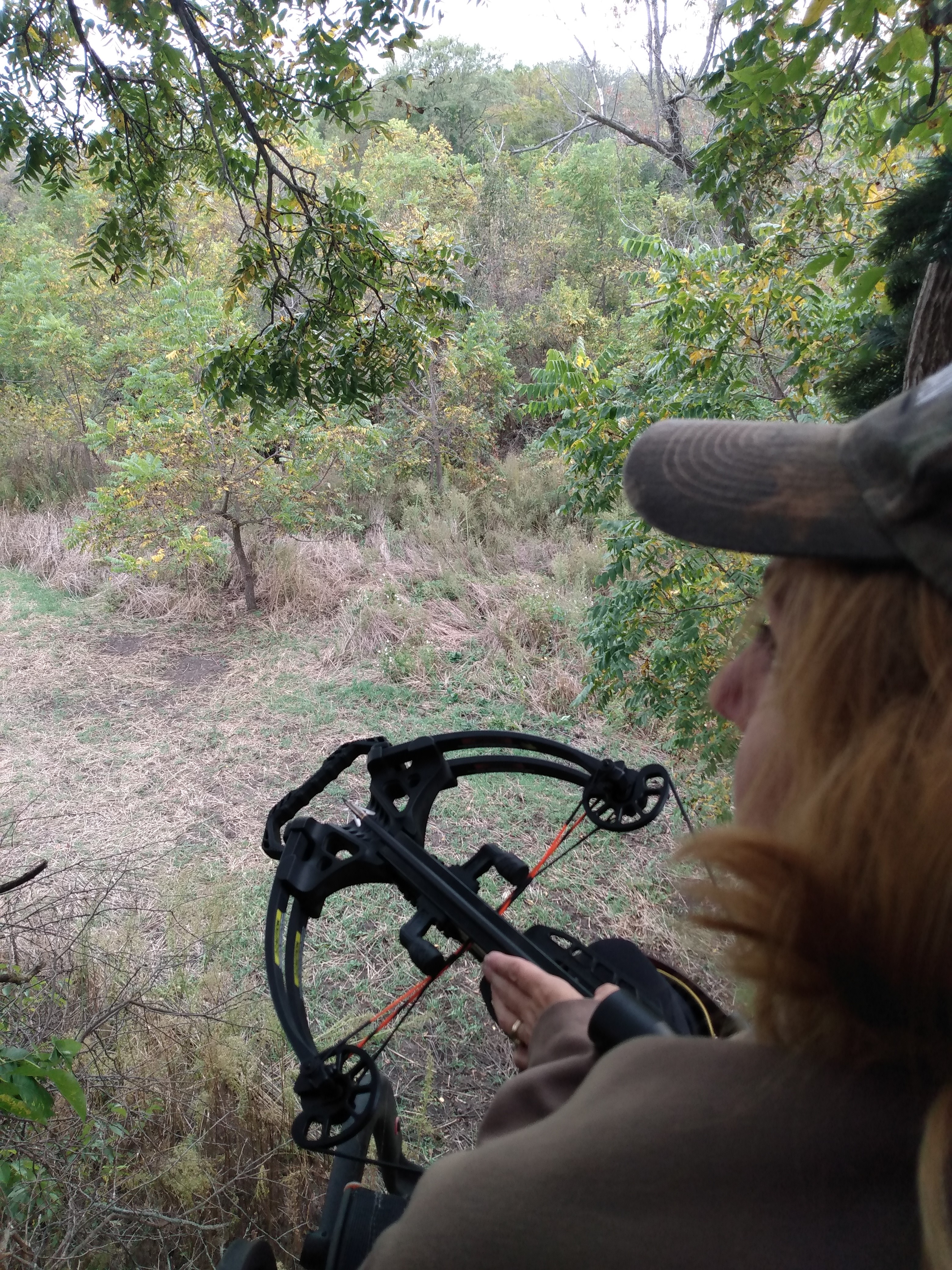 This is the north ditch crossing. Note the food is gone, but mock scrape remains. The game camera also used to be on that far small tree facing the ladder stand we are in…now it is right below the ladder stand facing the scrape. I was worried about facing the camera south into the sun but it worked just fine. Now we can check the camera without crossing where we expect the deer to walk. Note also Amy is using a crossbow…I won’t labor the reason why but several years ago she underwent surgery to remove her colon because of ulcerative colitis. She can no longer shoot a normal bow because of possible injury to her stoma. I’m so happy she is able to get back into the sport!