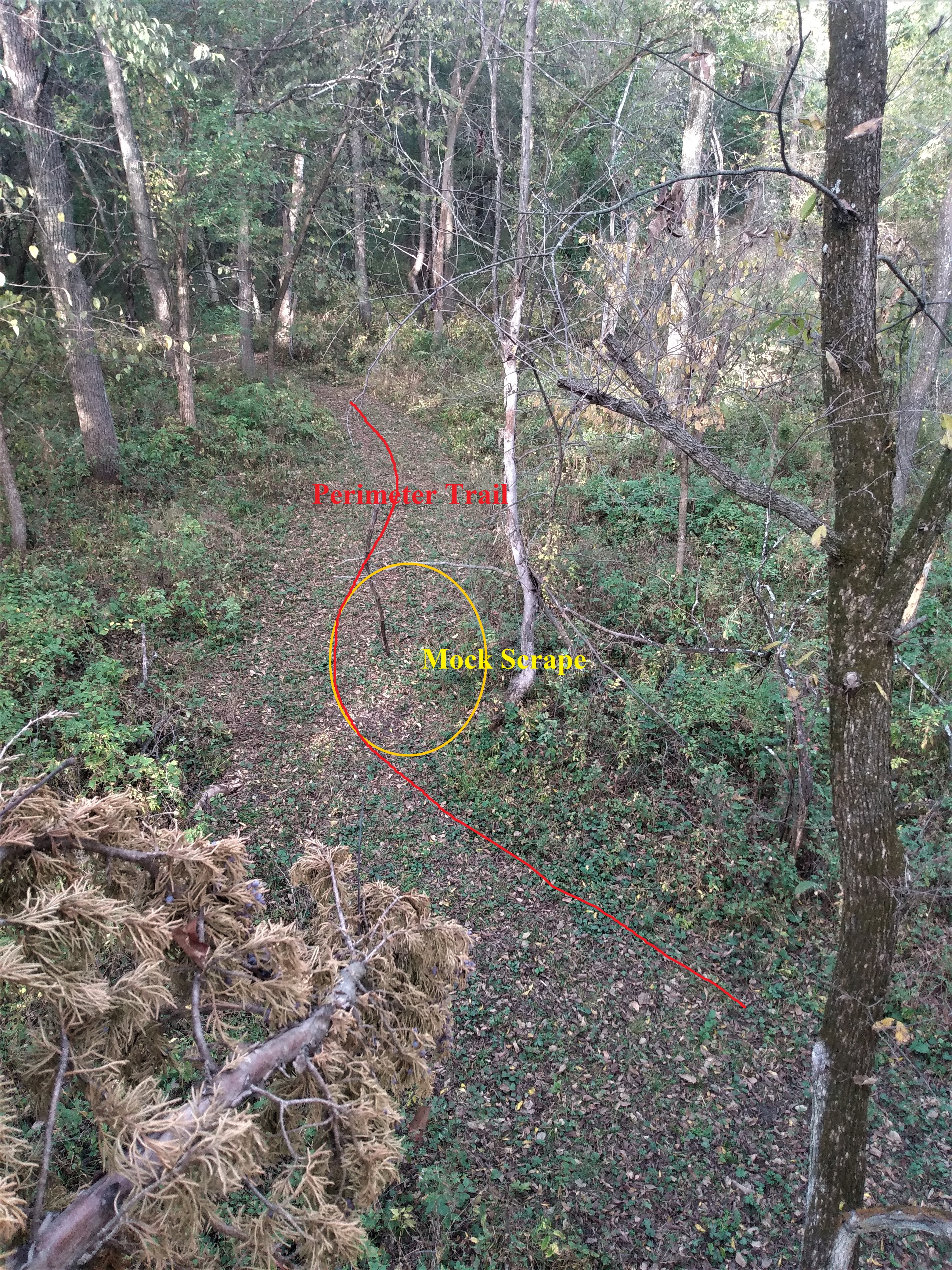 View from my stand tonight. A mock scrape over my left shoulder (I’m right handed) and a perimeter trail in close bow range. To my east is a deep ditch which funnels deer past this stand. I would say this stand every year gets really good late October and into November. The stand and scrape was as it should be upon inspection tonight.