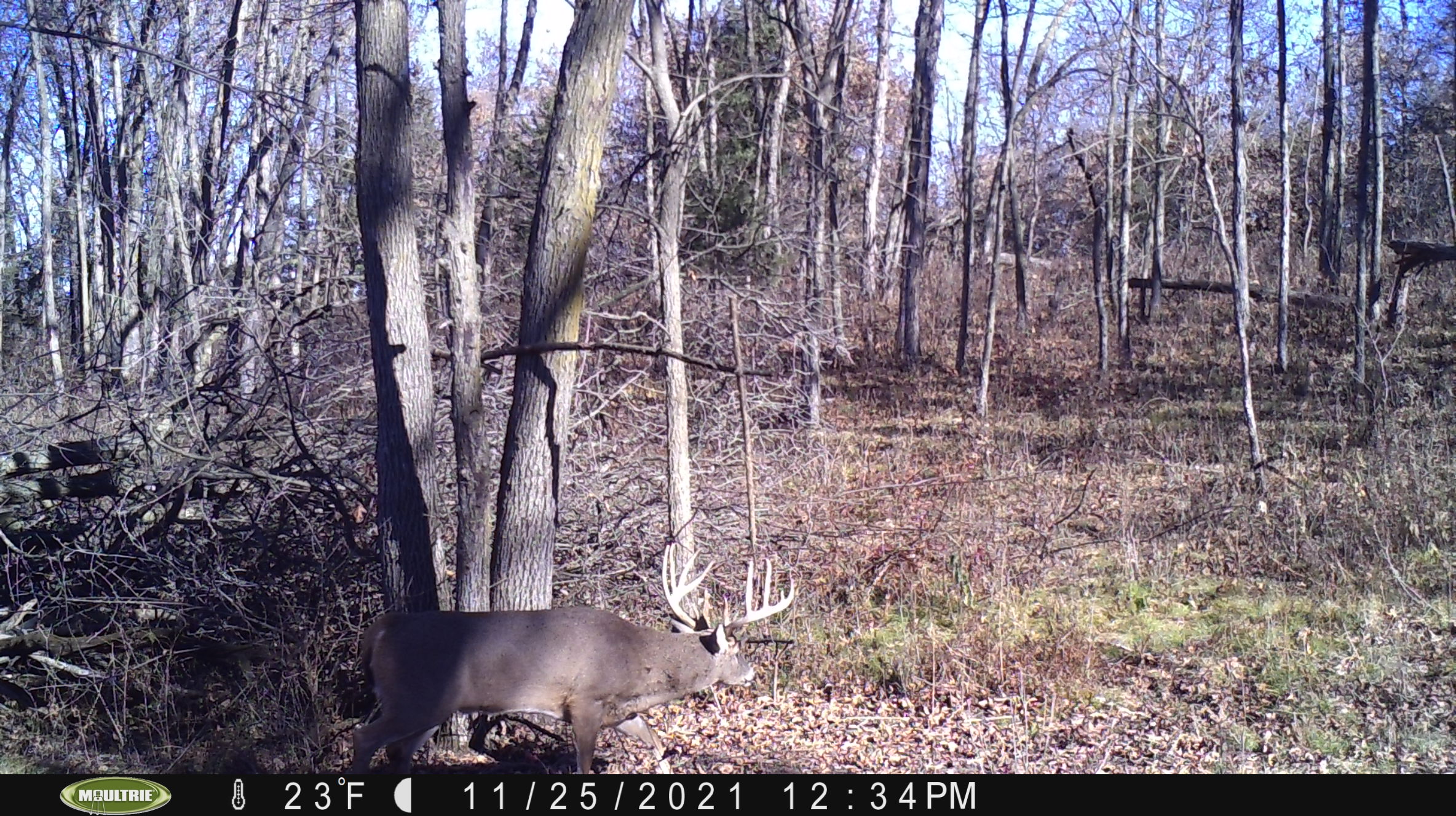 11/30 Still looking for that south wind, you would think with highs in the 60’s that we would have south winds but not so much. The wind forecast was for a NW wind turning to south around 4 tonight. I don’t know of a single stand we have that works for both of those winds. The fact that it was switch in late afternoon really makes it tough to pick an evening spot. I chose a new ladder stand overlooking a high ditch crossing at the cabin farm. It is a new stand that I put together this past winter while doing a bunch of bedding work on that farm. I basically cut and pushed a bunch of hickory into a ditch making deer want to avoid crossing anywhere except the high crossing. At that high crossing I have a ladder stand and mock scrape. I figured I’d go in today around noon…check a camera Forest and I put on the crossing around the 12th of November, then leave when the wind switched. It was kind of an inspection/observation/see how it looks sit tonight. Deer are definitely using the crossing and I did pick up another great buck using the crossing/mock scrape. I did see I have more cutting to do in there. Still way too many tall skinny hickories in there. I got in around 12:30 and had to leave by 2:30 as the wind was switching already to the south.