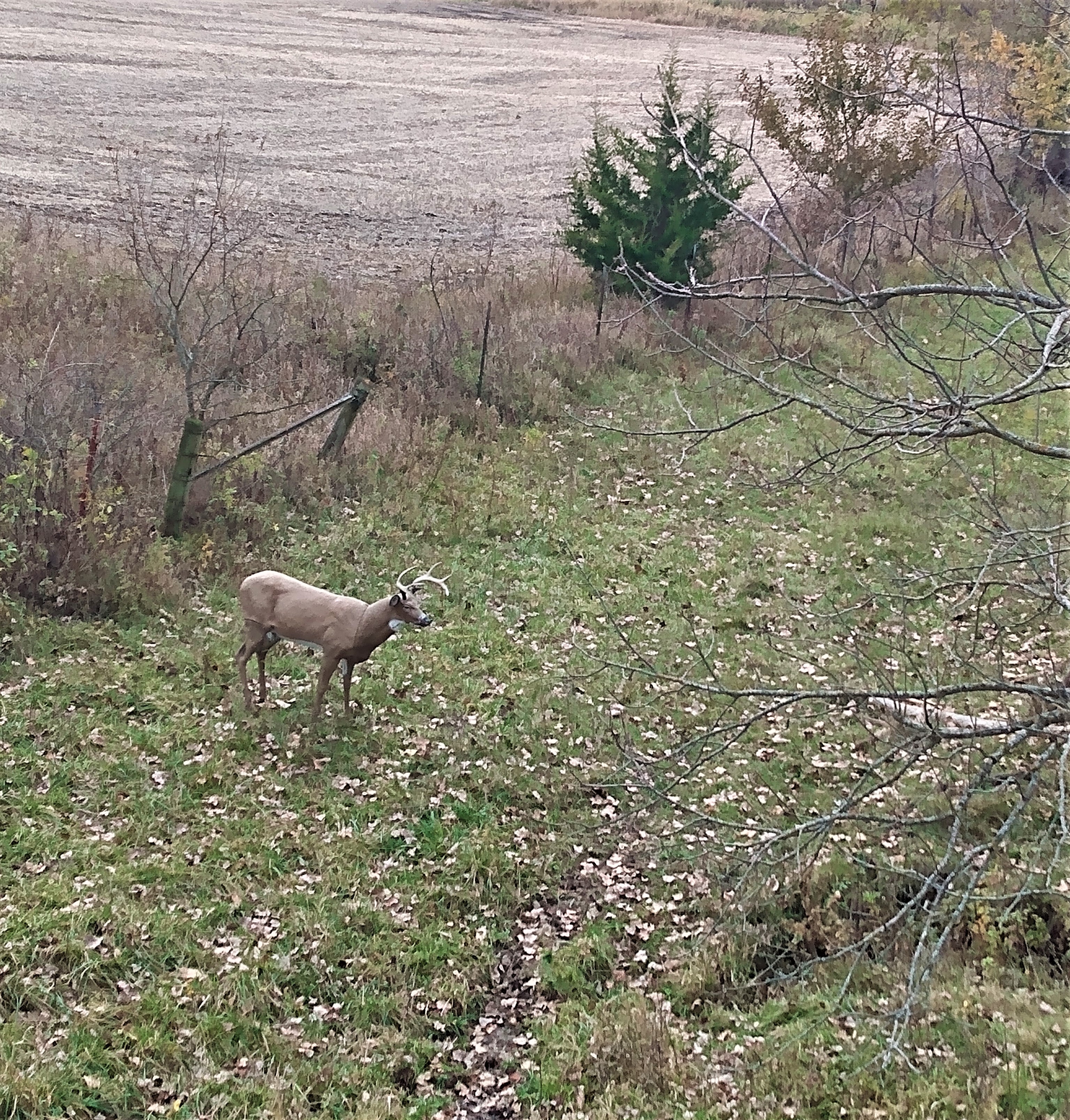 10/26 Sat this morning downwind of bedding on the neighbors. Saw three bucks and a doe with a fawn. Biggest buck was a 3 year old 8 point. Sat tonight in the stand I brushed in this morning overlooking a ditch crossing and saw 2 does, 2 fawns, and one decent buck that must have caught me moving because when I saw him he was running away from me at about 80 yards or so and he was not having it. Amy sat a small woodlot close to home and saw 5 does and fawns and one little buck. She was sitting on the ground along a fence line and said she almost could have touched a couple of the deer. It was windy tonight so as long as deer were upwind you were good. (unless you are moving around like I was). Looks like a lot of rain coming the next day or two, I’m going to try and sneak in another morning hunt before the skies open up again. We’ll see.