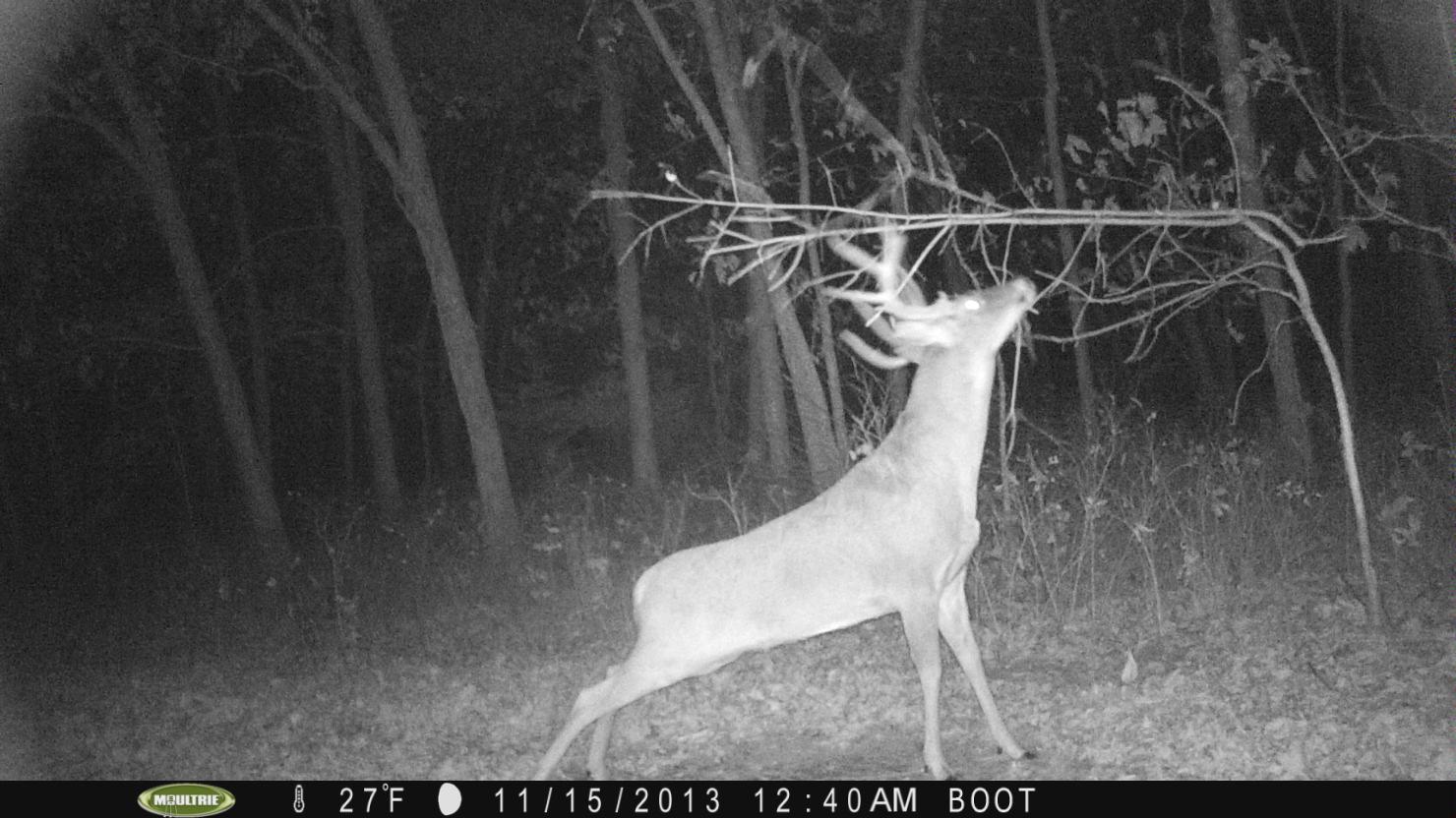 “Barkley” Published December 8, 2013 at 1480 × 832 in 2013 Photos Barkley working the mock scrape. I have more photos of mature bucks on this mock scrape made on a lane connecting an interior green plot with an exterior bean field than on any other camera.