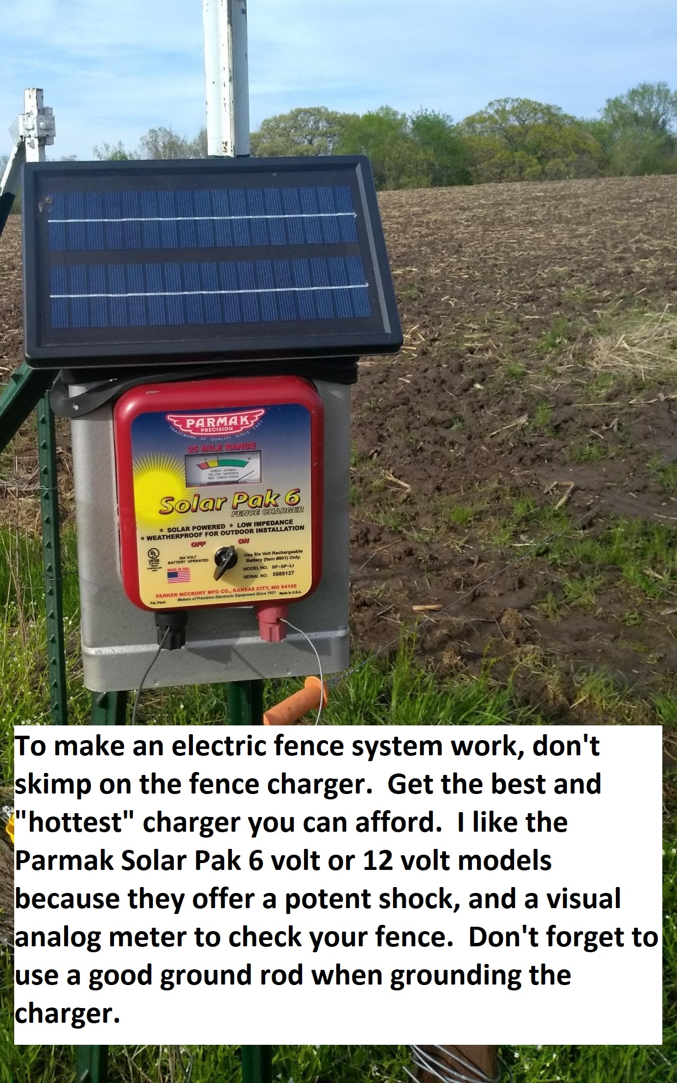 Next, make sure to pick a fence charger that has a good shock to it. This is one area you don’t want to skimp in. Electric fencers can run from $50 to as high as $300 or more. In most cases, a solar fence charger is going to be required because your plots simply aren’t close enough to plug a charger in. I have three different solar fence chargers I use for three different plots. All work, but are not created equal. The least effective is a Zareba model. Zareba makes good chargers but I cheaped out on this particular one and the shock is not very strong. I then bought a Gallagher. It is a nice unit, and offers a pretty good shock. My third unit is a Parmak solar fence charger that really packs a punch. Not only will it shock a deer to its senses, but it has a very nice analog meter on the front to tell you how strong the charger is performing. This makes it really nice when determining if there are weeds on the wires drawing down the shock, or if an insulator broke and the fence is no longer working. All three brands are good…just get as powerful a one you can afford.