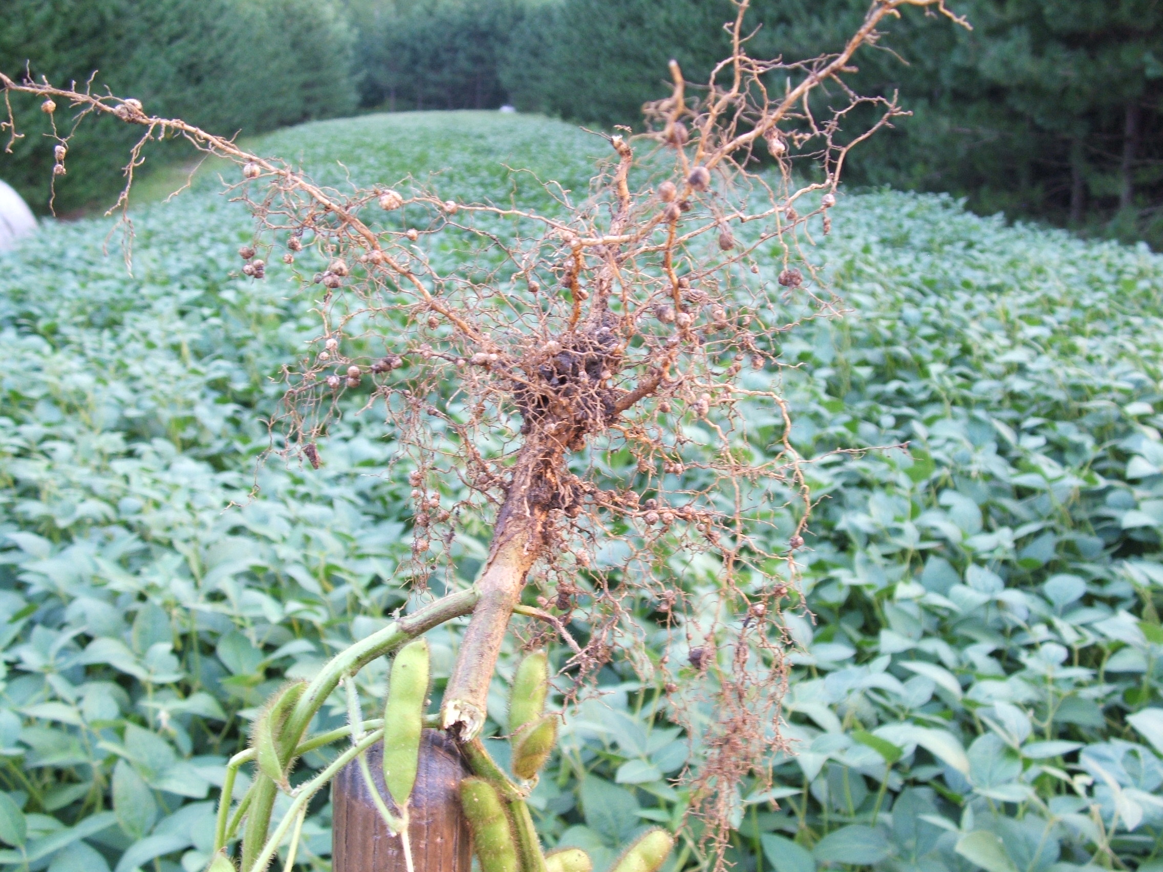This is the root of a soybean plant. You can see the nodules or colonies where the bacteria live and fix atmospheric nitrogen for the plant to use. By tilling in green soybeans you are able to take advantage of this process in legumes for the next crop.